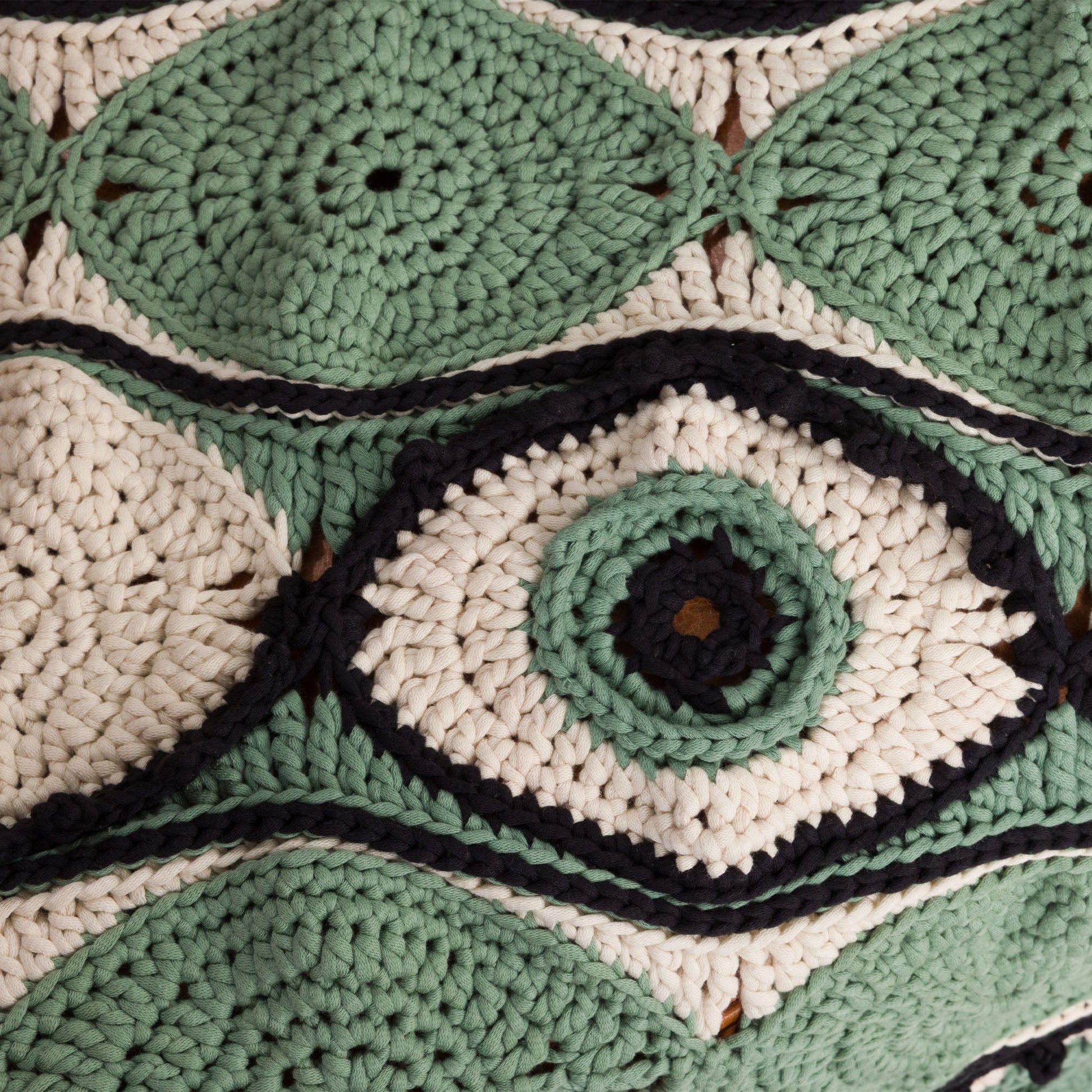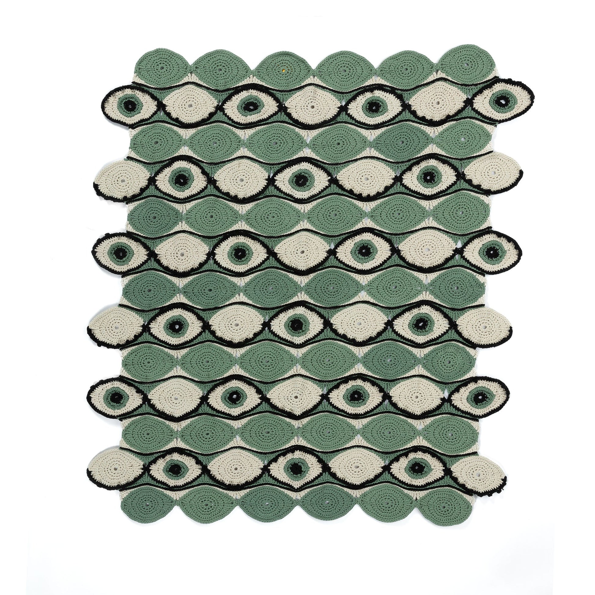 This captivating crochet blanket is a serene journey that evokes awareness and inner vision. Worked in Bernat Maker, soothing cream and sage tones with delicate black accents promote calm, as each motif, whether watchful, resting, or still, becomes a quiet meditation. Techniques include single, half double, double, and treble crochet, back loops, flat slip stitch seaming, and more. The rhythmic repetition of eyes opening and closing creates a calming ritual for the maker, inviting reflection with every join.
