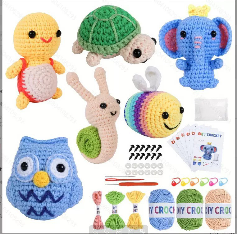 Materials: Yarn, crochet hooks, stuffing (assumed, based on product type)